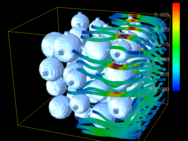 This program implements the so-called "Lattice Boltzmann Method" (LBM) to simulate incompressible fluids in 3D as described in [1]. It is the computationally most important part of a larger code which is used in the field of material science to simulate the behavior of fluids with free surfaces, in particluar the formation and movement of gas bubbles in metal foams (see the FreeWiHR homepage for animations of the results). For benchmarking purposes and easy optimization for different architectures, the code makes extensive use of macros which hide the details of the data access. A visualization of the results of the submitted code can be seen below (flow through a porous medium, grid size 150x150x150, 1000 time steps).