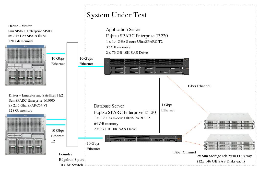 The only errors in the driver log files were those that are normally generated by this benchmark. On the database, incremental checkpointing ensured that no buffer will remain dirty (in the cache) for more than the allowed time. Oracle Application Server 10g Release 10.1.3.3 implements Recoverable Last Resource Commit (RLRC) optimization where one and only one SinglePhaseResource participates in a global transaction with one or more XAResources. This is accomplished by emulating an XAResource to represent the 1PC resource. The transaction manager takes the following steps when it receives a request to commit a global transaction that includes one emulated XAResource: 1. It invokes a prepare call on each of the 2PC resources. 2. If all of the 2PC resources are successfully prepared, then commit (one-phase) is called and the commit record is written to the commit-log, on the emulated XA resource (database) as part of the local transaction. 3. If the 1PC on the emulated XA resource completes successfully, then the transaction manager calls commit on each of the 2PC resources. or: If the 1PC on the emulated XA resource fails, then the transaction manager queries the commit-log for transaction outcome. If the record exists, 2PC resources are committed, otherwise 2PC Resources are aborted. Transaction outcome after a single point of failure is guaranteed by the presence of the commit-record in the commit log, indicating a successful transaction completion; while a missing commit-record signifies abort. The commit record is deleted lazily after the global transaction has committed. In conjunction with the RLRC implementation, the log-file location specified in the transaction-manager.xml identifies the location where the participating resource managers are recorded. The commit record table name associated with an instance is specified in the commit-record-table-name attribute, in the Connection-Factory element of data-sources.xml. 10 GbE Switch Details: Foundry EdgeIron 8-port 10GbE Switch - Product No. EIF8X10G 5x 10GbE XFP Transceivers - Product No. 10G-XFP-SR This result was measured on the Sun SPARC Enterprise T5220 and T5120. The Fujitsu SPARC Enterprise T5220 and Sun SPARC Enterprise T5220 are electronically equivalent. The Fujitsu SPARC Enterprise T5120 and Sun SPARC Enterprise T5120 are electronically equivalent. |