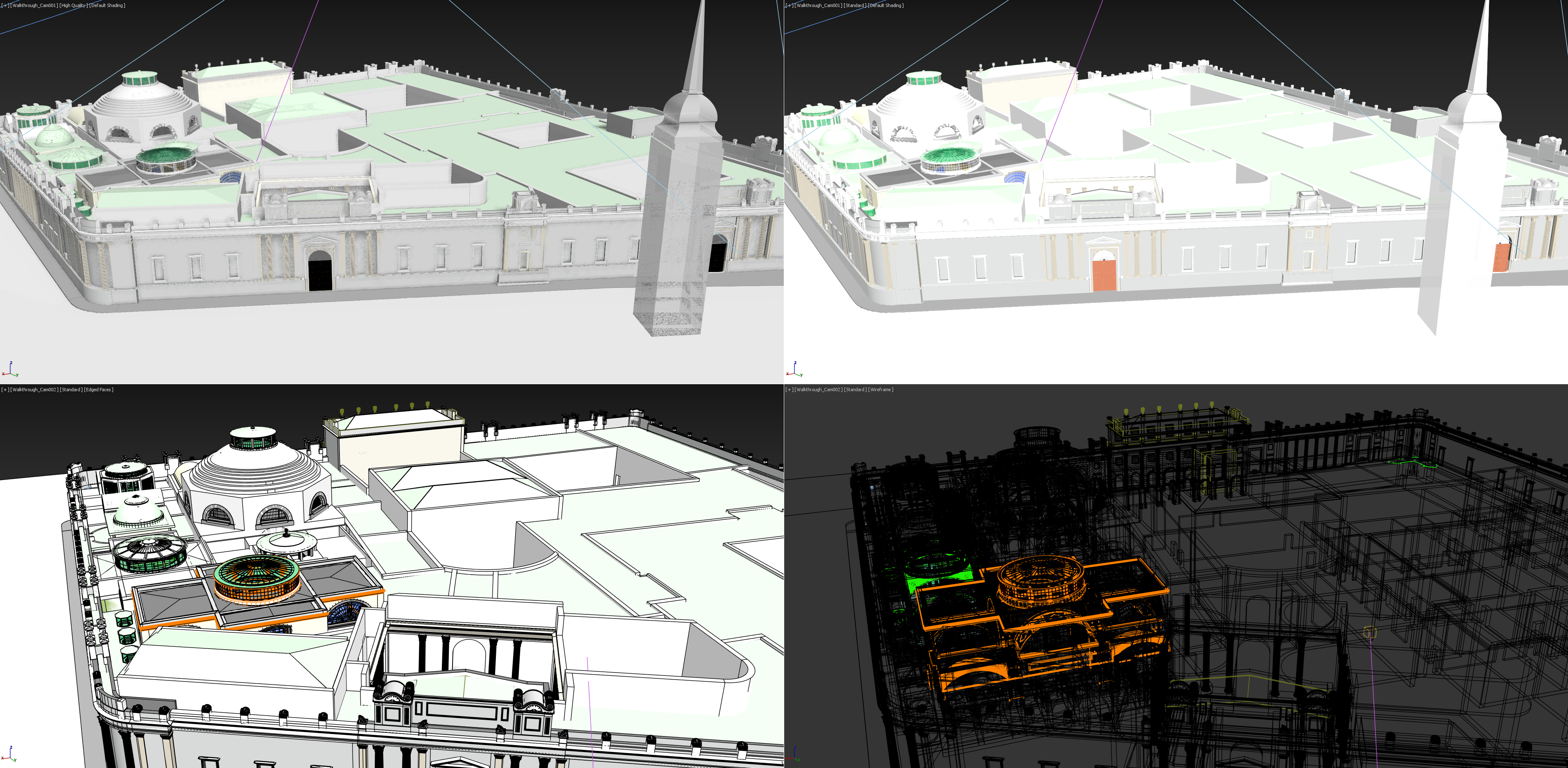 Wireframe metroverse scene on quad viewports