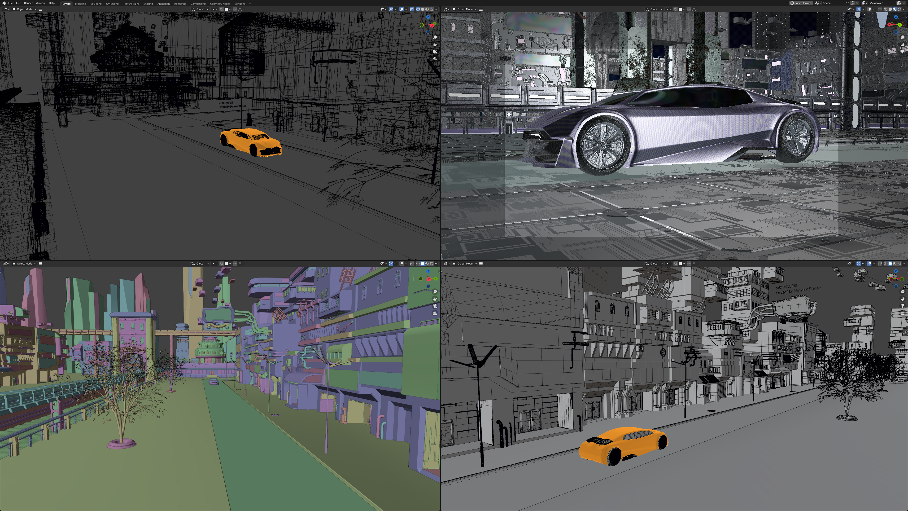 Metroverse scene on quad viewports using miscellaneous rendering modes
