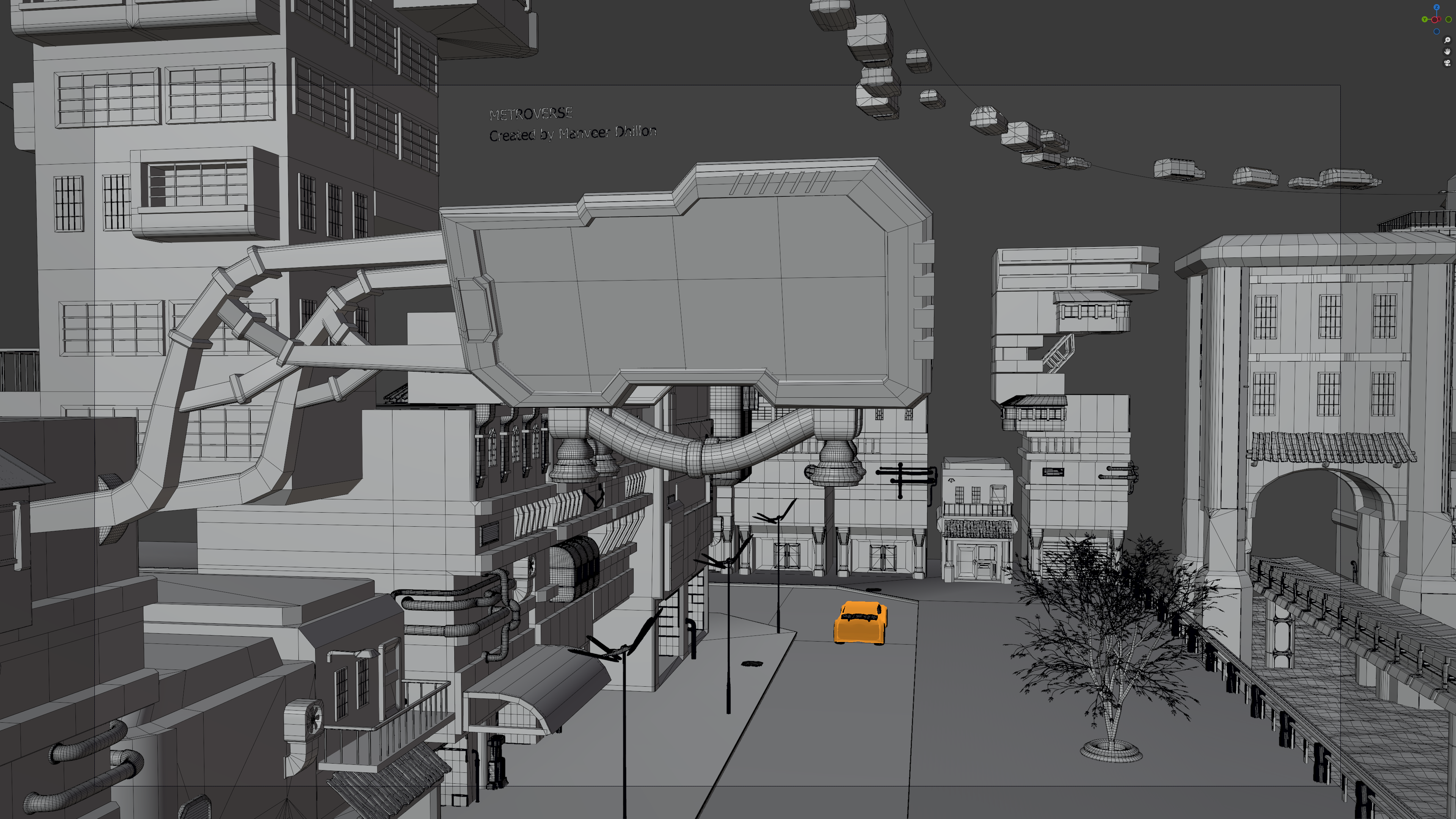 Shaded metroverse scene with a wireframe outline