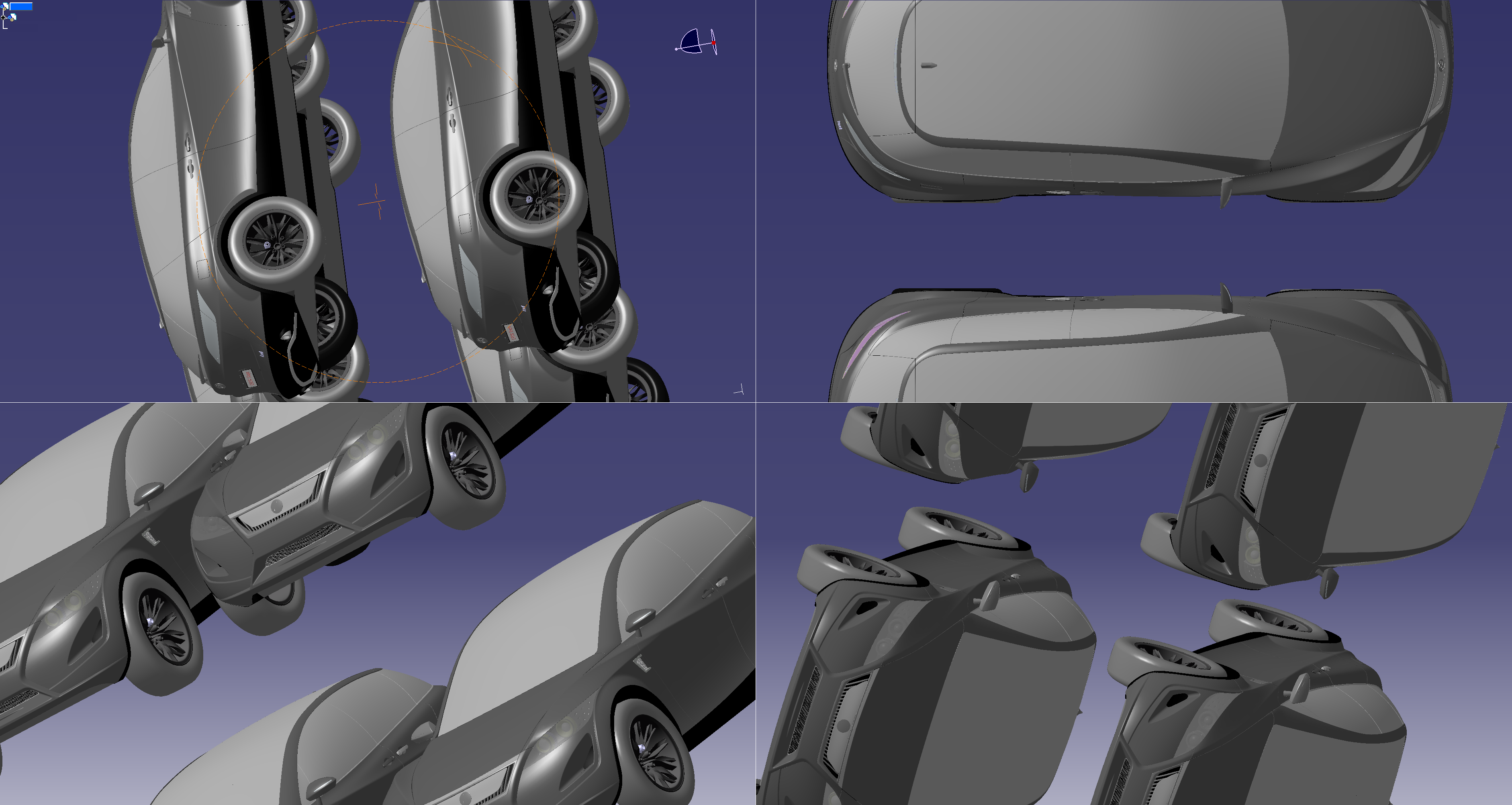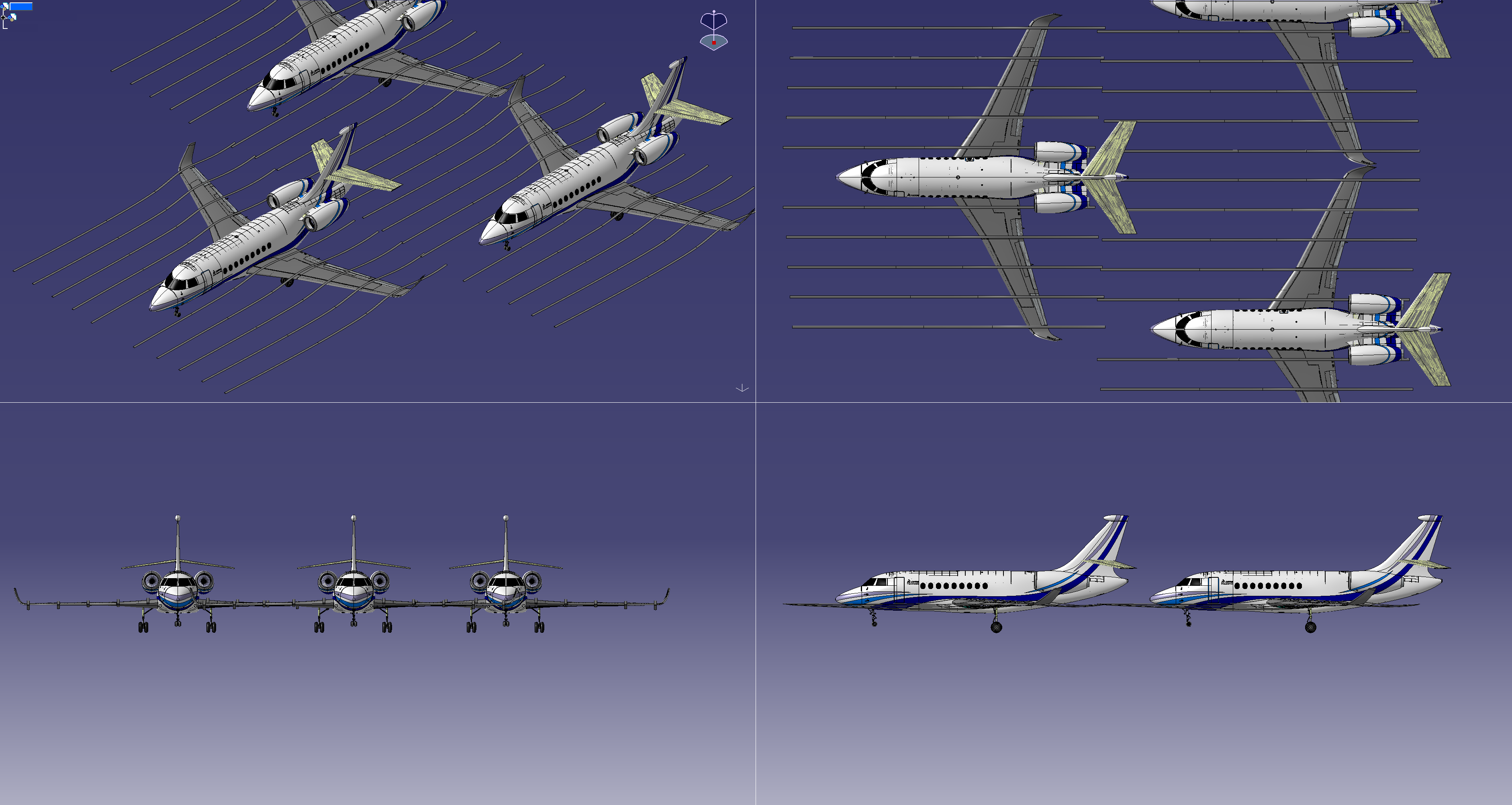 Wireframe metroverse scene on quad viewports