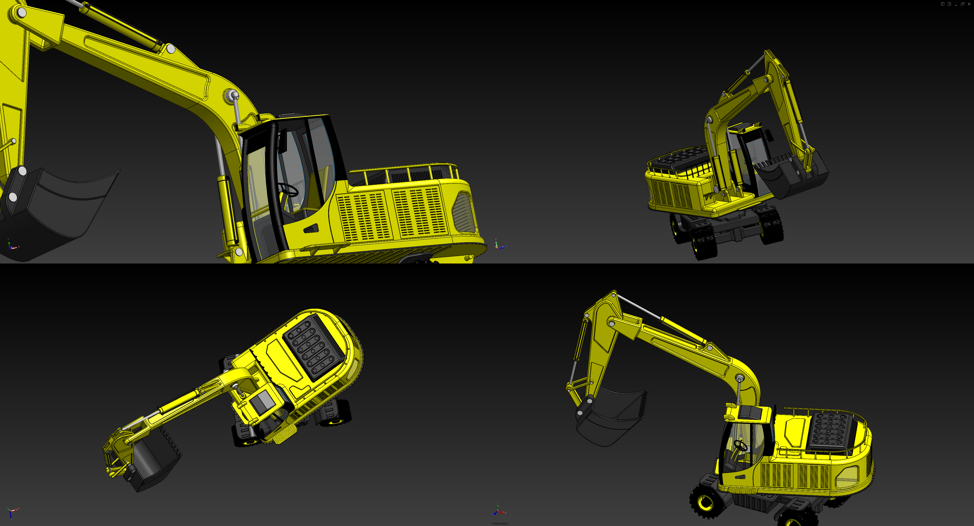 Shaded with edges excavator on four viewports