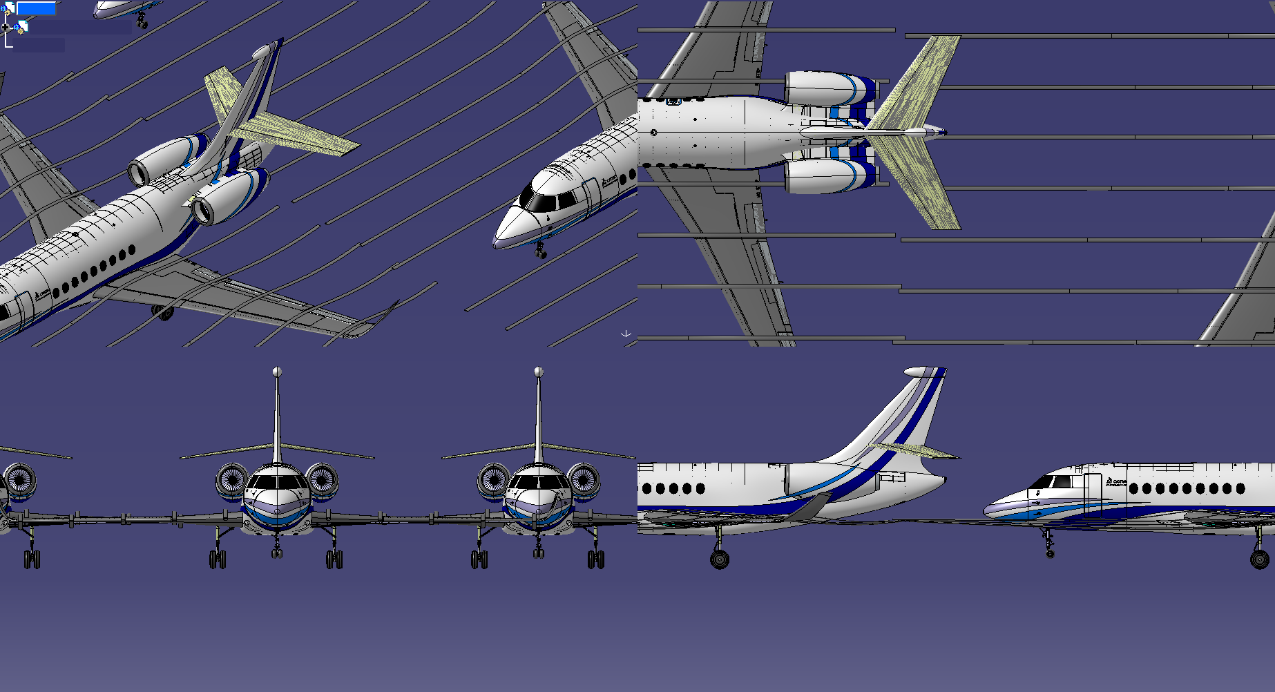 Wireframe metroverse scene on quad viewports