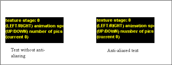 Figure 5 shows text rendered with and without FSAA. As you can see from the image, the anti-aliased text appears blurry when compared to the text without FSAA. Some fonts are more suitable than others for anti-aliasing techniques. Text that is rendered by graphical techniques, such as OpenGL line drawing, may suffer more acutely from anti-aliasing.
