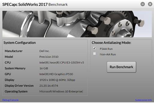 SPECapc for Solidworks 2017 is performance evaluation software for vendors and users of computing systems running Solidworks 2017 CAD/CAM software on Microsoft Windows 10 64-bit platforms.