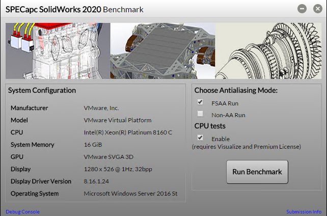 Features exercised in the SPECapc for SolidWorks 2020 benchmark are Order Independent Transparency (OIT), a modern methodology for quickly displaying transparency, and Full-Scene Anti-Aliasing (FSAA) for higher-quality visuals. The benchmark can be run with either the default anti-aliasing method (edges/sketches only) or with FSAA.