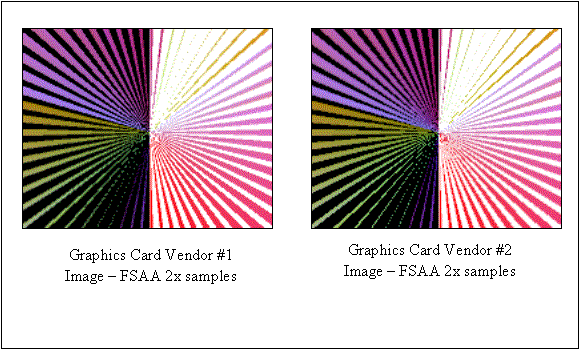 It is also important to note that graphics vendors use different techniques, algorithms and hardware to render FSAA images. It is difficult to directly compare the results from different vendors’ graphics cards or even across graphic card families from a single vendor, as the implementation of FSAA may vary between the products. Figure 6 contains screen image captures of the same graphic produced by two different graphics cards from two different manufacturers. Both used FSAA via multi-sampling with a sample size of two.