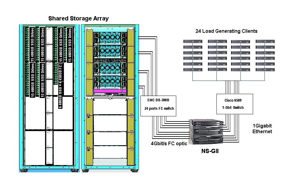 The NS-G8 Gateway Server system is a consolidation of file-based servers with NAS (NFS, CIFS) applications configured in a 2+1 High-Availability cluster. The servers deliver network services over high-speed Gigabit Ethernet. The cluster tested here consists of two active datamovers that each provides 4 Jumbo-frame capable Gigabit Ethernet interfaces and one stand-by datamover to provide high availability. The NS-G8 is a gateway to Shared Storage Array Symmetrix V-Max. The Symmetrix V-Max is a new storage architecture using 4 V-Max engines interconnected via a set of multiple active 4 Gbit/s FC HBAs connecting to the fabric.